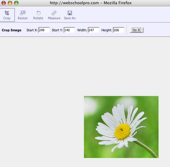 Use the cross hairs to select the part of the you would like to keep, everything else will be cropped.3) Click "Do It." Your new cropped image will appear.